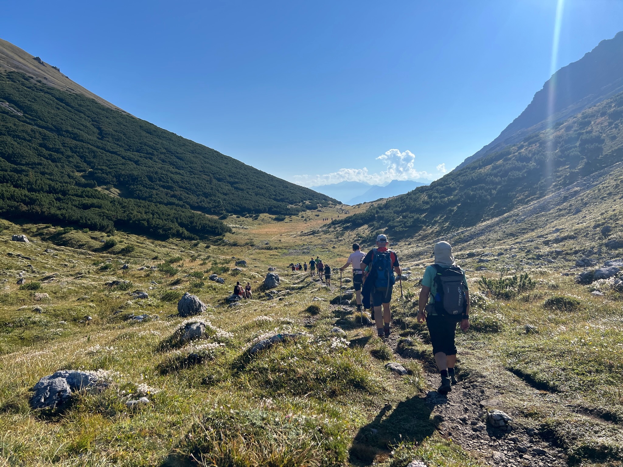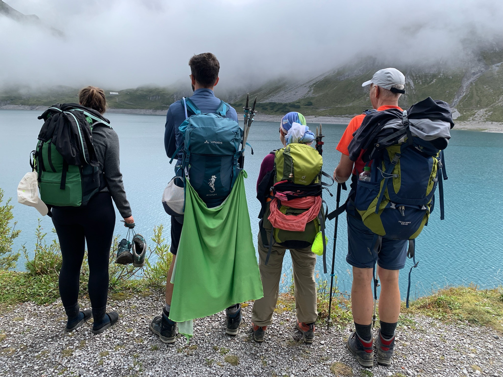 Heute ist der letzte Tag und obwohl es schade ist, dass unsere Wanderung zu Ende geht, ziehen wir trotzdem noch mal begeistert los, um unseren Weg über die vielen Jöcher zurück zur Douglas Hütte zu bewältigen. Und weil am Ende sogar noch mal kurz die Sonne durch scheint, überwindet sich ein Teil der Truppe noch mal kurz und verbotenerweise eine Runde im Lüner See schwimmen zu gehen.